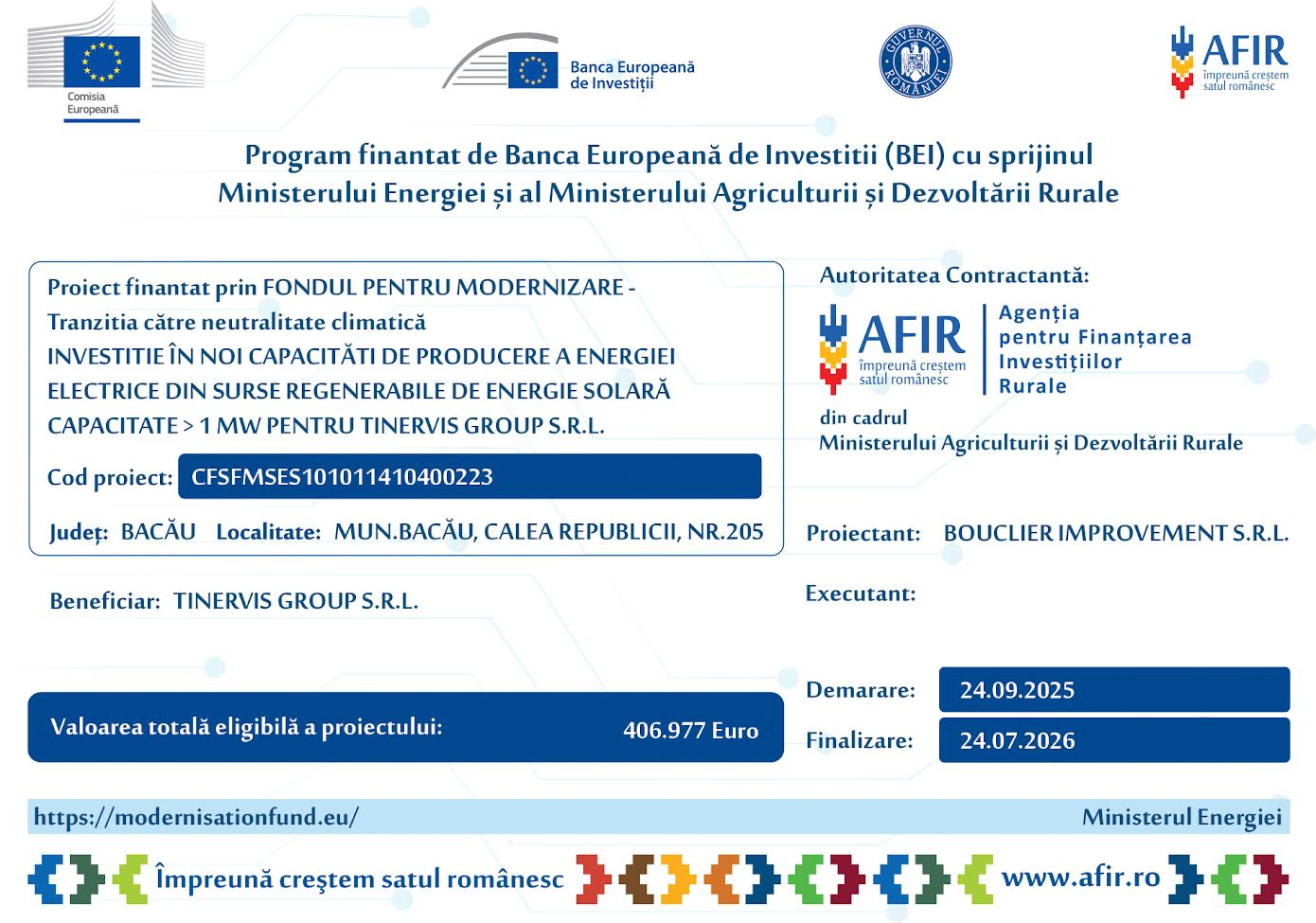 Proiectul este implementat în baza Contractului de finanțare nr. CFMSES101011410400223/24.09.2025, pe o perioadă cuprinsă între 24.09.2025 și 24.07.2026, în parteneriat cu Agenția pentru Finanțarea Investițiilor Rurale (AFIR).